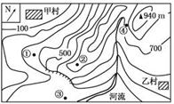 1.图中陡崖的相对高度可能是2.既能看到甲村又能看到乙村的地点是