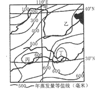A.丙地年蒸发量小于500毫米
