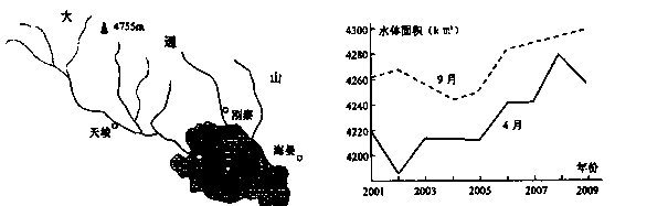 (1)依据材料一,青海湖2001至2009年4月与9月份水体面积变化曲线。青海湖水体面积总体上在不断扩大(2分)。