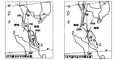 【小题1】从图中等值线可以看出,甲、乙两地1月和7月气温均高于25°C,温差小。甲地1月降水量在250-750mm之间,7月降水量在1500-2000mm之间,降水量季节变化幅度在750-1250mm之间;乙地1月降水量在1000-1250mm之间,7月降水量在1000-1500mm之间,降水量季节变化幅度在250-500mm之间。因此甲地降水量季节变化大于乙地。