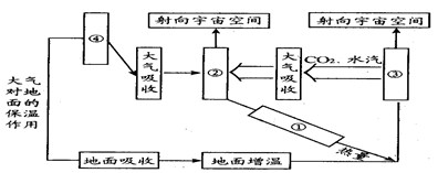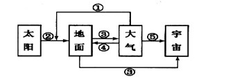 5、单选题  图中各箭头及其代表符号①、②、③、④、⑤表示太阳、地面、大气、宇宙空间之间的热力作用,其中包括太阳辐射、地面辐射、大气辐射、大气逆辐射、大气对太阳辐射的削弱作用(吸收、反射和射)读图回答下面1~2题。