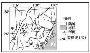小题1:图示区位于我国东南沿海地区,降水主要受夏季风影响。根据等温线分布判断,M处气温低,应属于山地地形,乙位于山地迎风坡,多地形雨,可能降水量最大,B对。甲处是河谷中,是背风坡,降水较少,A错。丙、丁没有地形影响,降水比乙地少,C、D错。