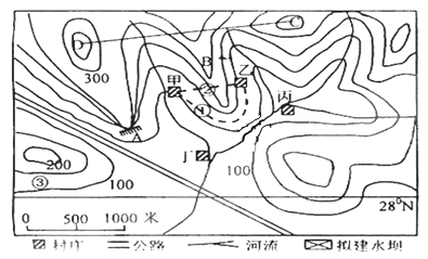 (3)为了解决未来该区域的用水、用电问题,该地区计划在丁村和丙村连线的中间位置处修建水电站。选择该处建坝的理由是______________________________;但随之可能带来的问题是_____________。(8分)
