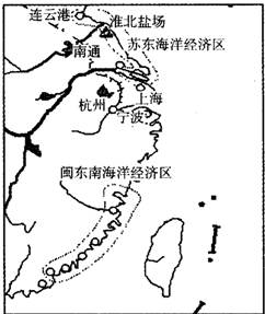 (1)苏东海岸线平直;闽东南海岸线曲折;(2分)