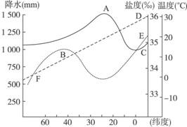 (1)代表海洋盐度曲线的是____________;代表降水分布曲线的是____________;代表海洋表面水温曲线的是____________。