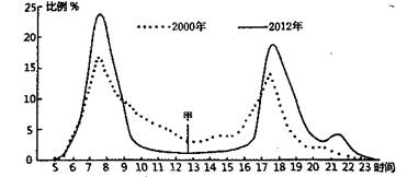 1.人员出行与图中曲线最相符的城市功能区是2.与2000年相比,2012年甲时段出行比例下降的主要原因是
