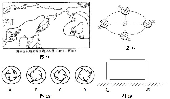 【小题5】在图19中的直线上补画箭头,以表示图16所处季节的季风环流。
