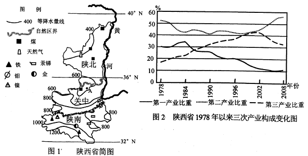 (2)此题考查学生对图表的描述和阐释能力,解决此类题要仔细读图,并注意分析,答题时要注意规范,表达清晰准确。图20反映陕西省自1978年以来三次产业结构变化,根据图例不难得出第一产业比重总体呈下降趋势,第二产业比重先降后升,但仍居主导地位,第三产业比重先增后降。