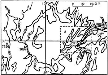 (1)图中所示的地形区是?,字母A所在的虚线区域地形以?为主。图中西侧属于我国从第?级阶梯向第?级阶梯过渡地带。(4分)