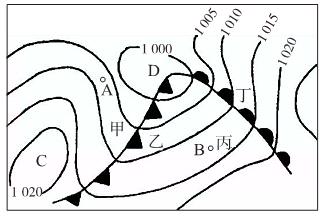 (1)从气压状况看,A点气压值?(高、低)于 B点气压值。从气团性质看,A为?,B为?。 (2)填写B地风向:B处为偏?;风力A处比B处????。 (3)如果冷、暖锋面均能引起降水,则雨区在??侧(填甲、乙、丙、丁)周围