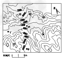 1.图中①、②、③、④位于谷地的有 [?] A.①? B.②? C.③? D.④ 2.下列叙述正确的有 [?] A.在甲处可见乙、丙、丁三处的地物 B.该地区地形破碎、沟谷发育 C.丙地位于甲地的正北方向 D.该地区最高地点海拔不超过2800米