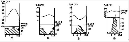 第一小题,热带气候,其气温终年在20℃以上且季节变化较小,四幅图中,,只有第④幅图完全符合条件。