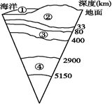 小题2:水圈(①层)是个连续而不均匀的圈层,A错误;地壳的厚度分布不均,大陆地壳有双层较厚,海洋地壳只有单层,较薄,B错误;一般认为岩浆的发源地是软流层,C正确;外核(④层)的主要成分虽以铁、镍为主,但却是液态,D错误。