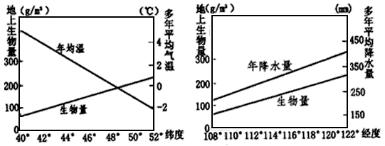 A.地形因素 B.洋流因素 C.太阳辐射 D.大气环流 参考答案: 本题解析:本题考查世界区域自然带的分布。 本题难度:一般 4、单选题 关于陆地环境的地域分异,表述正确的是 参考答案:C 本题解析: 本题难度:简单 5、单选题 生物量一般是指生物在某一特定时刻单位空间的个体数、重量或其所含能量。下图示意我国某区域地上生物量、年均温和年降水量随经纬度的线性变化。读图回答以下两题。 参考答案:1、A 本题解析: 本题难度:一般 |