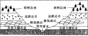 1、单选题 定西市位于甘肃中部,是一个生态环境十分脆弱的地方。多年来定西人因地制宜,总结形成了“山顶植树造林戴帽子,山坡退耕种草披褂子,山腰兴修梯田系带子,山下覆膜建棚挣票子,沟底筑坝蓄水穿靴子”的治理开发模式。读图回答下列各题。