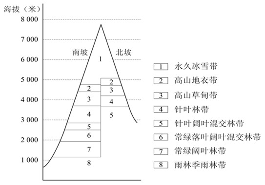 小题2:从图中山地海拔和山麓基带可判断出该山脉是喜马拉雅山。