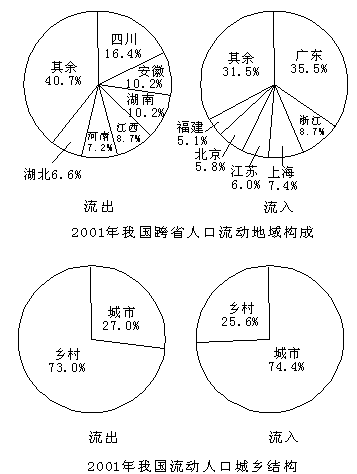 1、综合题  ? 人口迁移和城市化是人类社会发展历程中的重要现象。近年我国流动人口逐渐增加,2001年全国流动人口超过1.2亿。读图,分析回答下列问题。