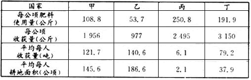 1、单选题 下表为四个国家在同一年度中的粮食作物生产的统计表。读袁回答1~2题。