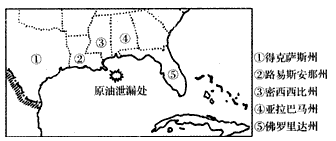 5、单选题 美国墨西哥湾—石油钻探平台于当地时间2010年4月20日晚发生爆炸,具体地点位于路易斯安那州东南84公里处(如下图),原油在海底以每日一千桶速度不断喷出,海面石油污染面积不断扩大,严重威胁生态环境。据此完成1—2题。