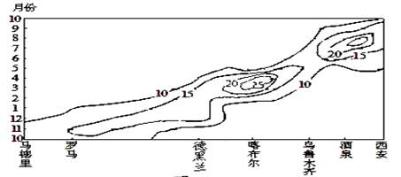 【小题2】该图为西班牙马德里到中国西安的各月降水占全年降水的百分比等值线分布图,无法判断降水总量的变化,只能够表明降水的季节差异和季节分配状况,可以看出在冬季自东向西降水率呈上升趋势,故D正确。