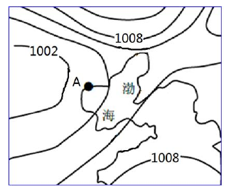 2009年4月14日晚,渤海沿岸发生了一次较强风暴潮,大量海水涌向陆地,给沿岸地区造成较大损失。下图为4月14日20时海平面等压线分布图(百帕)。