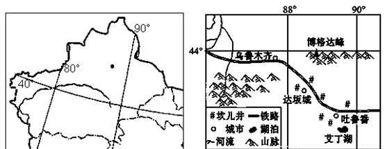 (2)达坂城地处西北内陆,受冬季风的影响大(1分),为温带大陆性气候,昼夜温差大,气温变化剧烈(或多山谷风)(1分);处于山口位置,是空气流通的通道(或狭管效应)(1分),因此多大风