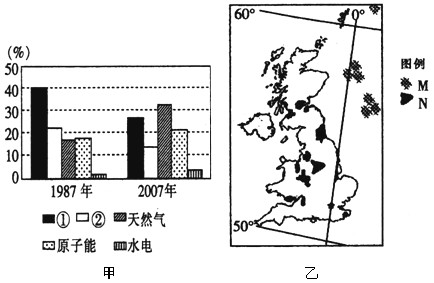 2、综合题 读英国能源结构变化图(甲)及英国主要能源分布图(乙),回答下列问题。