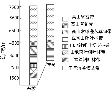 3、单选题 下图示意我国某山地的东坡和西坡的垂直带谱。读图,完成1—3题。