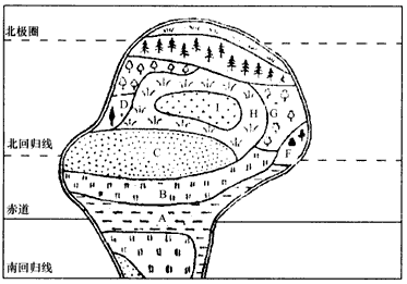 2、综合题 读“北半球理想大陆自然带分布图”,回答下列问题。
