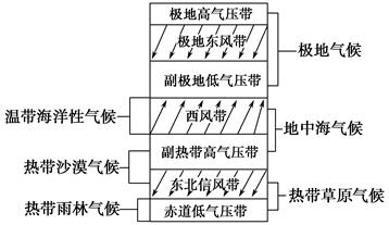 本题解析:不同气压带、风带控制区形成的气候类型各不相同,有的气候为单一气压带、风带控制形成,还有的是两个交替控制形成,其对应关系如下图所示: