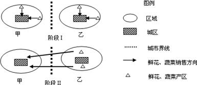 | 小题2:阶段Ⅱ鲜花和蔬菜产区的区位变化的主要原因是 A.城市用地规模的扩大 B.城市人口的增加 C.交通运输的发展 D.城市居民收入的提高