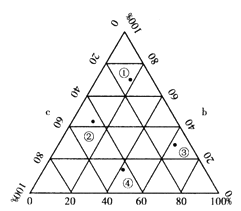 2.如果a、b、c分别代表影响工业区位的原料、能源、市场三个主要因素。图中最能代表炼铝工业的是3.如果a、b、c分别代表第一、第二、第三产业所占的比重。图中表示城市化水平最高的是