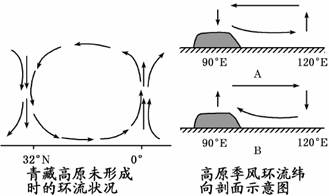 (4)青藏高原的隆起与其周围大气的热力差异形成了冬夏相反的高原季风。根据热力环流形成原理,请你判断材料2中高原季风环流出现的季节:A图表示?,B图表示?。