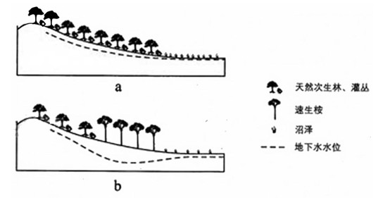 原产澳大利亚东北部热带雨林中的几种高大按树,主根深扎地下,能大量吸收地下水。这几种桉树适应性强,生长迅速,3-5年即可成材,统称“速生桉”,我国西南地区某地引种速生桉作为造纸原料。图中a、b分别示意该地速生桉种植前、后的变化。