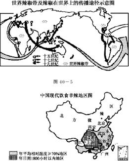 3、综合题 读世界辣椒带和辣椒在世界上的传播途径示意图及中国现代饮食辛辣地区图,回答: