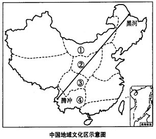 (1)图中黑河到腾冲之间的连线是我国重要的_________地理分界线,它穿越了我国多个特色鲜明的地域文化区。