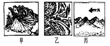 (1)结合图示判断:甲表示在河流出山口形成的山麓冲积扇;乙表示河流入海口形成的河口三角洲;丙表示沙丘;