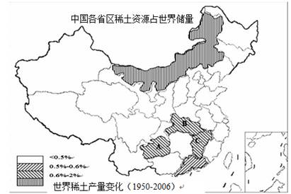 (2)读图,根据图中曲线的数值,可以判断1960-1985年美国稀土产量比重大。1985-2006年中国产量增长快,目前中国产量占绝大部分。