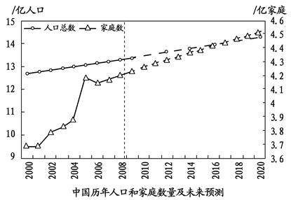 2、单选题 读“中国历年人口和家庭数量及未来预测示意图”,判断下列描述正确的是( )