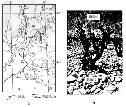 葡萄的糖分含量越高,酿制出的葡萄酒酒精度越高。葡萄生长过程中,特别是 成熟的光照及昼夜温差与其糖分积累呈正相关。图a中甲、乙两地均为优质葡萄产地。图b为乙地典型的葡萄种植园景观。世界上酒精度最高(16.2度)的优质葡萄酒就是使用乙地及其附近所产的葡萄酿制而成的。