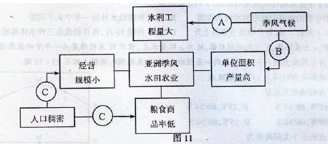 (2)图示地区农业机械化水平?,图中字母代表的内容,对当地机械化水平影响较大的是?,日本机械化水平相对较高的原因是?。(3分)