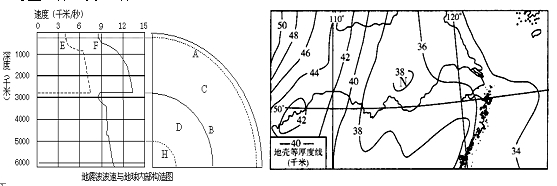 1、综合题 左图是地震波波速与地球内部构造图,右图是我国东部部分地区地壳等厚度线图,读图回答下列各题:(每空2分,共10分)