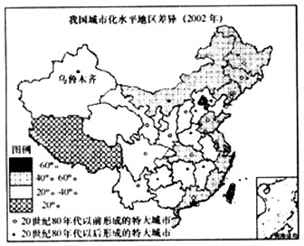 1、衡量城市化水平的主要指标是 [? ] A、城市人口占总人口的比重 B、城市用地占土地总面积的比重 C、城市经济总量占区域经济比重 D、城市数量占区域聚落数量的比重 2、从图上分析可知,下列说法正确的是 [? ] A、我国中部各省中,只有湖北的城市人口比重均在40%以上 B、20世纪80年代以后,中部地带新增的特大城市数超过东部 C、我国两南地区的城市人口比重均在20%以下 D、总的说来,经济越发达的省份,城市人口比重越高