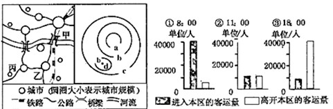 3、单选题 读某区域城市分布图、甲城市地租等值线示意图)以及甲城某区域日均地铁分时段客运量统计图,回答1~3题