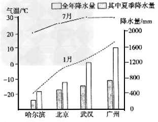 2、单选题 读“哈尔滨、北京、武汉、广州四城市年降水量和月平均气温的变化图”,下列说法正确的是