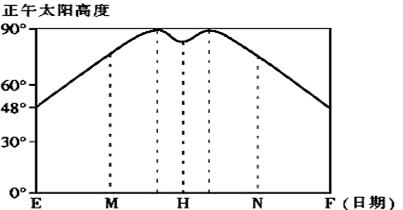 3、单选题  下图为某地一年中正午太阳高度变化示意图,图中M、N分别为EH、HF的中点,H日该地正午太阳位于正北方。读图完成下列问题。 1.该地的地理纬度是2.下列时段中,北京昼长夜短且昼越来越短的是3.当M日时