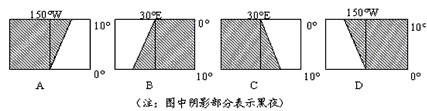 2、若下图表示的是南半球的状况,当北京时间12点时,下列四图中与之相符的是