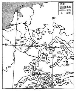 ⑶若需将本流域和另一水系的M河用运河相连,请设计一条最佳的线路,并在图中用运河符号(图例中已给出)标出。