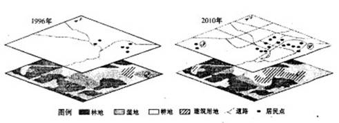 2.图示信息显示:居民点向西南方向发展,湿地面积减小,耕地面积扩大,林地面积变化不大。湿地面积减小,地下水源将减少。图示信息显示,交通、土地利用图层叠加可用于城市和工业区选址,因此相关地理要素图层叠加可用于道路规划。
