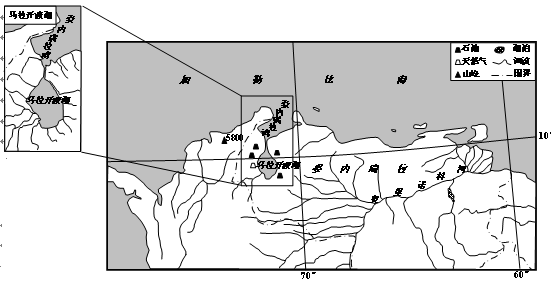 5、综合题 (16分)下图是南美洲局部示意图。图中委内瑞拉是世界重要石油生产与出口国之一,石油资源主要分布在西部的马拉开波湖地区以及委内瑞拉的东部和中部等地区。回答下列各题。